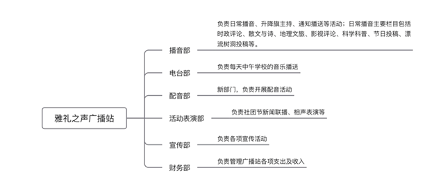 电视台的职能有很多,包括但不限于制作微电影,负责学校开学典礼、休学典礼等学校工作的班级现场直播,每年一度的雅礼特色社团节线上直播、拍摄、制作,制作学校宣传片,制作新闻节目,拍摄专题节目等。