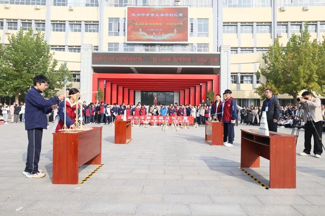 10月26日,陕州中学博雅广场热闹非凡,第五届科创活动“抛石机攻城比赛”精彩上演,29支参赛代表队携带自制的重力式抛石机同台竞技,以3米外杯子搭建的城堡为目标,用智慧与协作演绎科创魅力。
