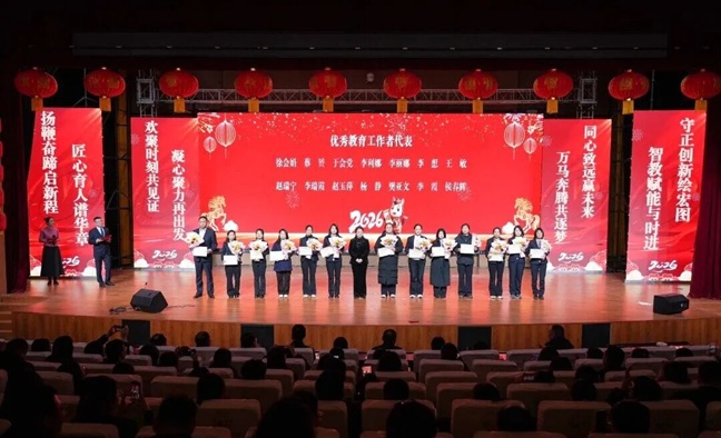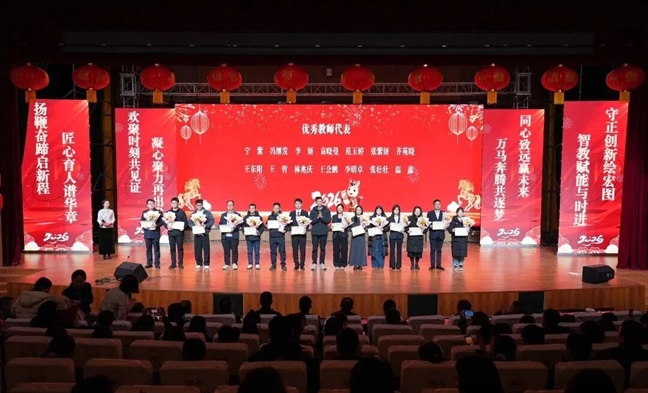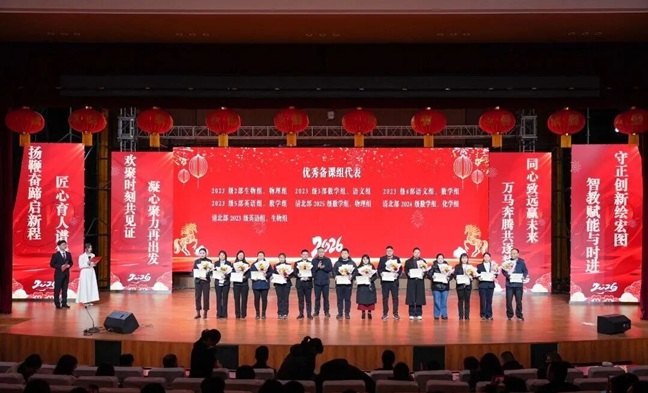 校长李明宣读《关于表彰2025—2026学年上学期先进集体和优秀个人的决定》,明确授予2个标兵处室、28个优秀备课组、55名优秀班主任、126名优秀教师、38名优秀教育工作者荣誉称号。随后,颁奖环节有序开展,共分5项9批进行。校党委书记徐永立,校长李明,副校长赵玉玺、蔡伟全,校工会主席陈明刚,副校长王成金、逯晓蔚分别为优秀备课组、标兵处室、优秀班主任、优秀教师、优秀教育工作者代表颁奖,每一次颁奖都伴随着热烈掌声,将大会氛围一次次推向高潮。